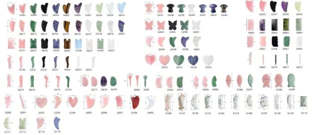 Additionally, we can produce more than 50+ types of facial gua sha tools, such as heart-shaped guasha tool, finger-shaped guasha tool, crosier-shaped guasha tool, leaf-shaped guasha tool, butterfly-shaped guasha tool and so on . We can provide any colors, any customized logos or exquisite package for you.